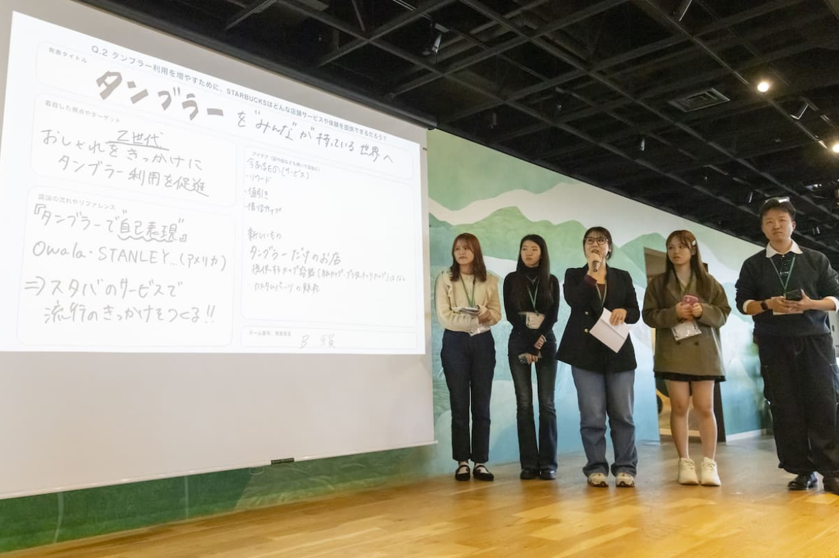 ○○さんのグループでは「タンブラー利用を増やすための店舗サービスや体験」をテーマに、Z世代に向けておしゃれをきっかけに利用を広めるアイデアを提案しました。具体的には、季節限定デザインやファッション性を取り入れたタンブラーで利用を広げる提案をしました。「かっこいい文化をつくりたい」という想いがスターバックスの理念と重なり共感を呼びました。